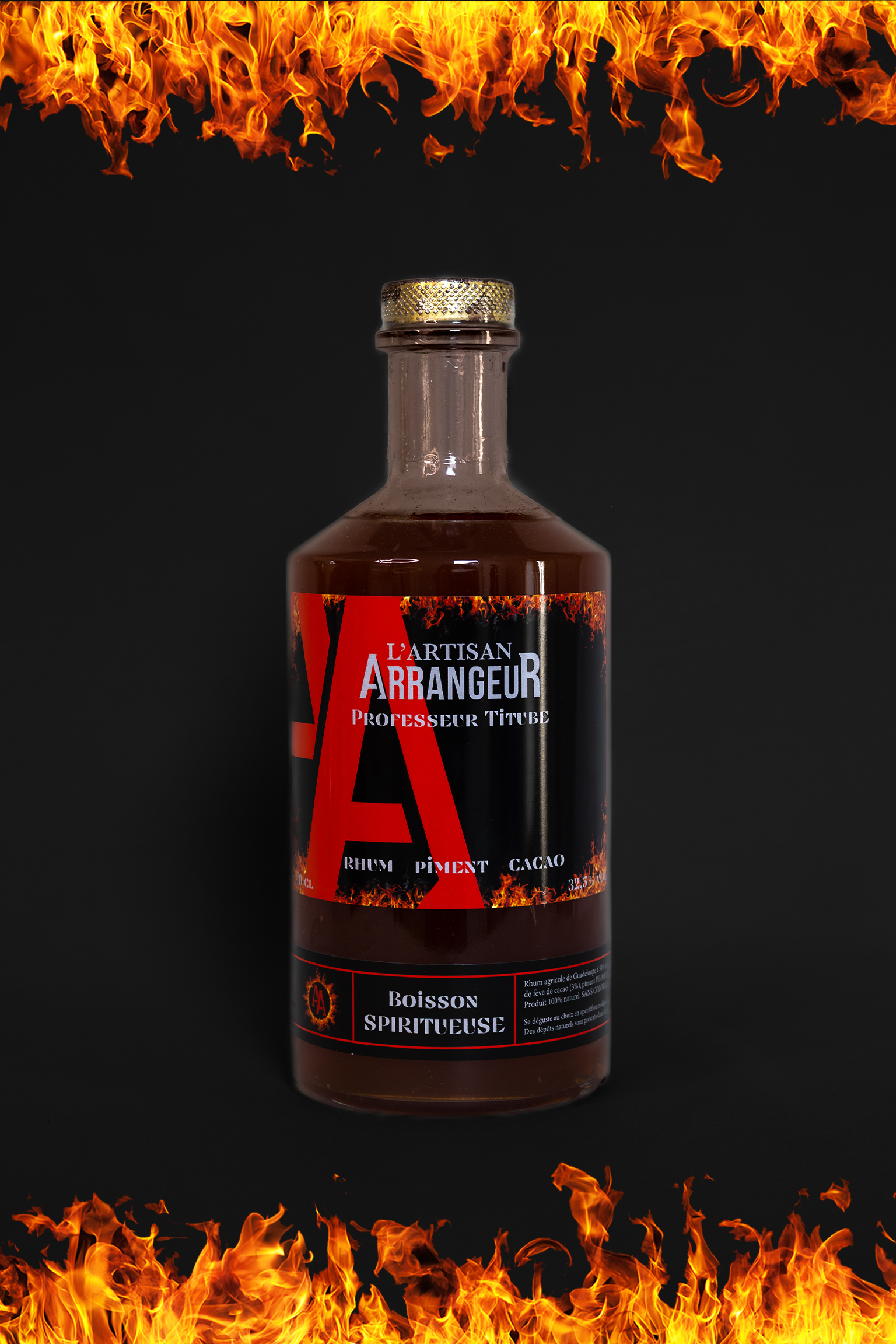 Ingrédients : Rhum agricole de Guadeloupe à 50%vol (64%), sirop maison (eau, sucre) à base de fève de cacao (3%), piment Pili-Pili (0,35%). Produit 100% naturel, SANS COLORANT NI AROME ARTIFICIEL.